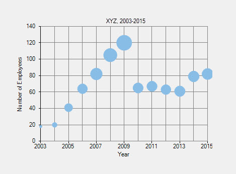 // create a datatable DataTable dt = new DataTable("Company XYZ,2003-2015"); // add columns to the datatable dt.Columns.Add("Year", typeof(int)); dt.Columns.Add("Number of Employees", typeof(int)); dt.Columns.Add("Annual Revenue", typeof(int)); // add rows to the datatable dt.Rows.Add(2003, 18, 50); dt.Rows.Add(2004, 20, 55); dt.Rows.Add(2005, 41, 80); dt.Rows.Add(2006, 64, 100); dt.Rows.Add(2007, 82, 130); dt.Rows.Add(2008, 105, 160); dt.Rows.Add(2009, 120, 200); dt.Rows.Add(2010, 65, 105); dt.Rows.Add(2011, 67, 106); dt.Rows.Add(2012, 63, 100); dt.Rows.Add(2013, 61, 110); dt.Rows.Add(2014, 79, 115); dt.Rows.Add(2015, 82, 120); // clear data series collection flexChart1.Series.Clear(); // create data series C1.Win.Chart.Series series1 = new C1.Win.Chart.Series(); // add the data series to the data series collection flexChart1.Series.Add(series1); // specify the datasource for the chart flexChart1.DataSource = dt; // bind X-axis and Y-axis series1.BindingX = "Year"; series1.Binding = "Number of Employees,Annual Revenue"; // set the chart type to bubble flexChart1.ChartType = C1.Chart.ChartType.Bubble;