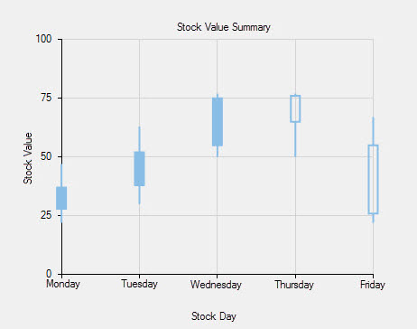 // create a datatable DataTable dt = new DataTable("Stock Value Summary"); // add columns to the datatable dt.Columns.Add("Stock Day", typeof(string)); dt.Columns.Add("Stock Open", typeof(int)); dt.Columns.Add("Stock High", typeof(int)); dt.Columns.Add("Stock Low", typeof(int)); dt.Columns.Add("Stock Close", typeof(int)); // add rows to the datatable dt.Rows.Add("Monday", 37, 47, 22, 28); dt.Rows.Add("Tuesday", 52, 63, 30, 38); dt.Rows.Add("Wednesday", 75, 77, 50, 55); dt.Rows.Add("Thursday", 65, 77, 50, 76); dt.Rows.Add("Friday", 26, 67, 22, 55); // clear data series collection flexChart1.Series.Clear(); // create data series C1.Win.Chart.Series series1 = new C1.Win.Chart.Series(); // add the data series to the data series collection flexChart1.Series.Add(series1); // specify the datasource for the chart flexChart1.DataSource = dt; // bind X-axis and Y-axis flexChart1.BindingX = "Stock Day"; series1.Binding = "Stock High,Stock Low,Stock Open,Stock Close"; // set the chart type to candlestick flexChart1.ChartType = C1.Chart.ChartType.Candlestick;