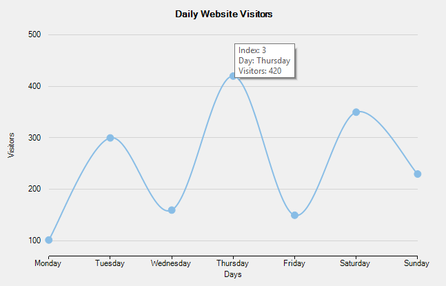 // set the Content property flexChart1.ToolTip.Content = "Index: {pointIndex}\nDay: {name}\n{seriesName}: {Visitors}";