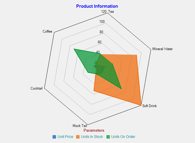 FlexRadar is a radar chart that is also known as polar chart, star chart, web chart, or spider chart due to its appearance. The chart plots value of each category along a separate axis that starts from the center and ends on the outer ring. All axes are arranged radially, with equal distances between each other, while maintaining the same scale between all axes. Each category value is plotted along its individual axis and all the values are connected together to form a polygon. Common business applications of FlexRadar can include skill analysis of employees and product comparison. It is important to note that the FlexRadar control represents a polar chart when X values are numbers that specify angular values in degrees.
