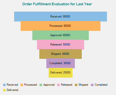 The following code manually creates data containing values for the amount of orders across seven stages of an order fulfillment process. The snippet sets the chart type as Funnel, specifies the dimensions of the Funnel neck, and sets Header, Legend, and Data Labels of the chart.
