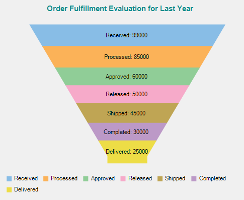 // clear the Series collection flexChart1.Series.Clear(); // create data var data = new[] { new { Name = "Received", Value = 99000 }, new { Name = "Processed", Value = 85000 }, new { Name = "Approved", Value = 60000 }, new { Name = "Released", Value = 50000 }, new { Name = "Shipped", Value = 45000 }, new { Name = "Completed", Value = 30000 }, new { Name = "Delivered", Value = 25000 } }; // create an instance of Series C1.Win.Chart.Series series1 = new C1.Win.Chart.Series(); // add the instance to the Series collection flexChart1.Series.Add(series1); // set y-binding series1.Binding = "Value"; // set x-binding and add data to the chart flexChart1.BindingX = "Name"; flexChart1.DataSource = data; // set the chart type as Funnel flexChart1.ChartType = ChartType.Funnel; // set the Funnel chart type as Default (Trapezoid chart) flexChart1.Options.FunnelType = FunnelChartType.Default; // set the Funnel neck height flexChart1.Options.FunnelNeckHeight = 0.05; // set the Funnel neck width flexChart1.Options.FunnelNeckWidth = 0.2;