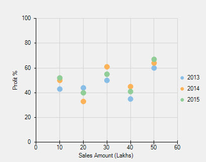 // clear data series collection flexChart1.Series.Clear(); // create data series C1.Win.Chart.Series series1 = new C1.Win.Chart.Series(); C1.Win.Chart.Series series2 = new C1.Win.Chart.Series(); C1.Win.Chart.Series series3 = new C1.Win.Chart.Series(); // add data points into the data series series1.BindingX = "X"; series1.Binding = "Y"; series1.DataSource = new System.Drawing.Point[] { new System.Drawing.Point(10,43), new System.Drawing.Point(20,44), new System.Drawing.Point(30,50), new System.Drawing.Point(40,35), new System.Drawing.Point(50,60)}; series1.Name = "2013"; series2.BindingX = "X"; series2.Binding = "Y"; series2.DataSource = new System.Drawing.Point[] { new System.Drawing.Point(10,50), new System.Drawing.Point(20,33), new System.Drawing.Point(30,61), new System.Drawing.Point(40,45), new System.Drawing.Point(50,64)}; series2.Name = "2014"; series3.BindingX = "X"; series3.Binding = "Y"; series3.DataSource = new System.Drawing.Point[] { new System.Drawing.Point(10,52), new System.Drawing.Point(20,40), new System.Drawing.Point(30,55), new System.Drawing.Point(40,41), new System.Drawing.Point(50,67)}; series3.Name = "2015"; // add the data series to the data series collection flexChart1.Series.Add(series1); flexChart1.Series.Add(series2); flexChart1.Series.Add(series3); // set the chart type to scatter flexChart1.ChartType = C1.Chart.ChartType.Scatter;