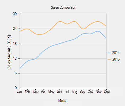 // create a datatable DataTable dt = new DataTable("Sales - 2014 vs 2015"); // add columns to the datatable dt.Columns.Add("Month", typeof(string)); dt.Columns.Add("Sales in 2014", typeof(int)); dt.Columns.Add("Sales in 2015", typeof(int)); // add rows to the datatable dt.Rows.Add("Jan", 8, 23); dt.Rows.Add("Feb", 11, 24); dt.Rows.Add("Mar", 12, 22); dt.Rows.Add("Apr", 15, 22); dt.Rows.Add("May", 17, 24); dt.Rows.Add("Jun", 18, 27); dt.Rows.Add("Jul", 19, 26); dt.Rows.Add("Aug", 20, 27); dt.Rows.Add("Sep", 22, 24); dt.Rows.Add("Oct", 22, 26); dt.Rows.Add("Nov", 23, 27); dt.Rows.Add("Dec", 20, 25); // clear data series collection flexChart1.Series.Clear(); // create data series C1.Win.Chart.Series series1 = new C1.Win.Chart.Series(); C1.Win.Chart.Series series2 = new C1.Win.Chart.Series(); // add the data series to the data series collection flexChart1.Series.Add(series1); flexChart1.Series.Add(series2); // name the series series1.Name = "2014"; series2.Name = "2015"; // specify the datasource for the chart flexChart1.DataSource = dt; // bind X-axis and Y-axis flexChart1.BindingX = "Month"; series1.Binding = "Sales in 2014"; series2.Binding = "Sales in 2015"; // set the chart type to spline flexChart1.ChartType = C1.Chart.ChartType.Spline;