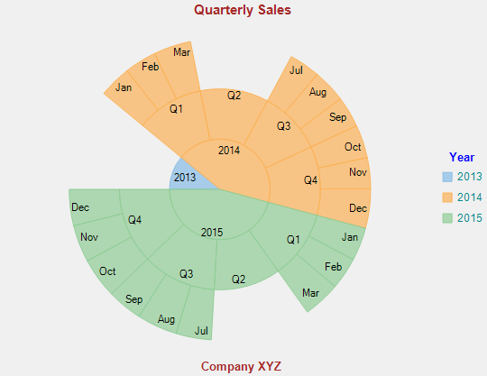 ' set the legend orientation Sunburst1.Legend.Orientation = C1.Chart.Orientation.Vertical ' set the legend position Sunburst1.Legend.Position = C1.Chart.Position.Auto ' set the legend stroke color Sunburst1.Legend.Style.StrokeColor = Color.DarkCyan ' Set the legend font Sunburst1.Legend.Style.Font = New Font("Arial", 9, FontStyle.Regular) ' set the legend title Sunburst1.Legend.Title = "Year" ' set the legend title stroke color Sunburst1.Legend.TitleStyle.StrokeColor = Color.Blue ' set the legend title font Sunburst1.Legend.TitleStyle.Font = New Font("Arial", 10, FontStyle.Bold) ' set the header Sunburst1.Header.Content = "Quarterly Sales" ' set the header font Sunburst1.Header.Style.Font = New Font("Arial", 11, FontStyle.Bold) ' set the header stroke Sunburst1.Header.Style.Stroke = Brushes.Brown ' set the footer Sunburst1.Footer.Content = "Company XYZ" ' set the footer font Sunburst1.Footer.Style.Font = New Font("Arial", 10, FontStyle.Bold) ' set the footer stroke Sunburst1.Footer.Style.Stroke = Brushes.Brown