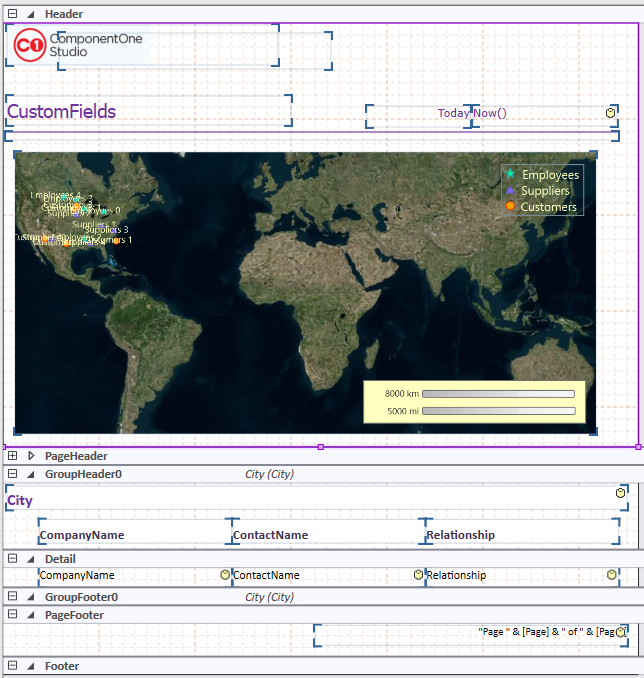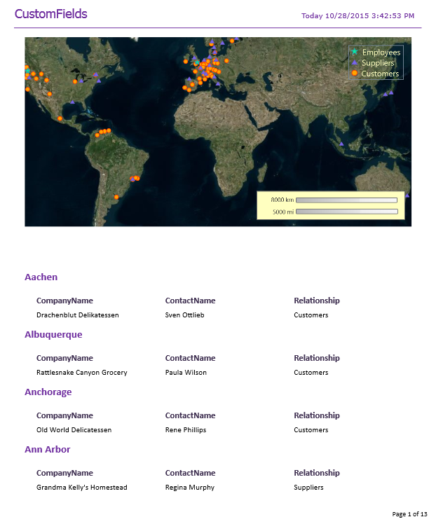 Now that you familiar with the basics of Map field, let us add a map to a report showing Employees, Suppliers, and Customers summarized by City.