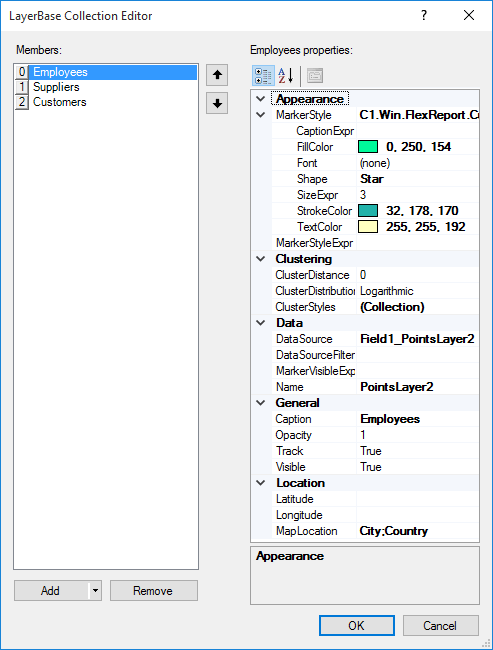 Click ellipsis button next to Layers collection to open LayerBase Collection Editor. Add Members 'Employees', Suppliers', and 'Customers', select the data source and set their marker style and map location properties.