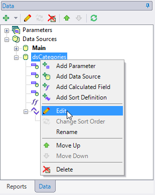 When you create a new data bound report, the first thing you do is select a data source. With the FlexReportDesigner application, you can easily edit all the data sources to which the report and its elements are bound.