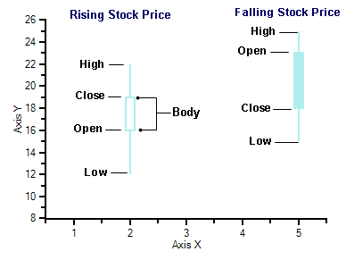 The Candle chart is made up of the following elements: candle, wick, and tail. The candle or the body (the solid bar between the opening and closing values) represents the change in stock price from opening to closing. The thin lines, wick and tail, above and below the candle depict the high/low range. A hollow candle or transparent candle indicates a rising stock price (close was higher than open). In a hollow candle, the bottom of the body represents the opening price and the top of the body represents the closing price. A filled candle indicates a falling stock price (open was higher than close). In a filled candle the top of the body represents the opening price and the bottom of the body represents the closing price.