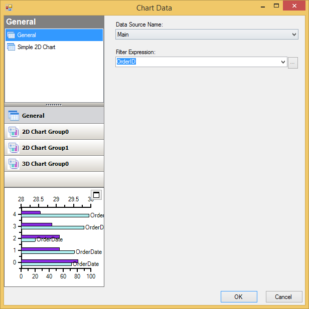 Note: If you don't select a chart type for data [Group1] then the elements for data [Group1] will not appear in the list box in the left pane of the Chart Properties dialog box. |