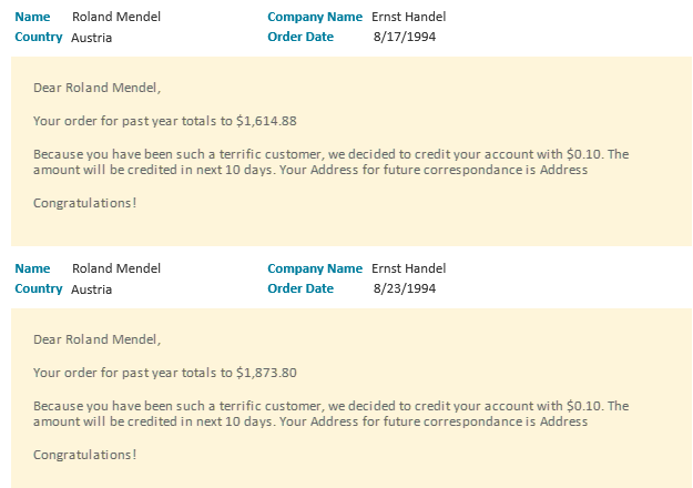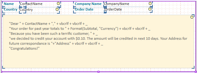 "Your order for past year totals to " + Format(Subtotal, "Currency") + vbcrlf + vbcrlf + _