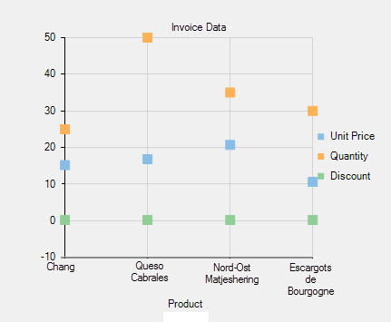 // retrieve data from the data source string conPath = @"Provider=Microsoft.Jet.OLEDB.4.0; Data Source=C:\\Users\\Windows 8.1\\Desktop\\C1NWind.mdb"; string conQuery = "SELECT * FROM [Order Details] WHERE OrderID = 10327"; OleDbDataAdapter da = new OleDbDataAdapter(conQuery, conPath); // fill the dataset da.Fill(ds); // bind the binding source to the dataset bs.DataSource = ds.Tables[0]; // bind the chart to the binding source flexChart1.DataSource = bs; // clear the series collection flexChart1.Series.Clear(); // create new series C1.Win.Chart.Series series1 = new C1.Win.Chart.Series(); C1.Win.Chart.Series series2 = new C1.Win.Chart.Series(); C1.Win.Chart.Series series3 = new C1.Win.Chart.Series(); // add the created series to the series collection flexChart1.Series.Add(series1); flexChart1.Series.Add(series2); flexChart1.Series.Add(series3); // name the series series1.Name = "Unit Price"; series2.Name = "Quantity"; series3.Name = "Discount"; // bind X-axis flexChart1.BindingX = "Product"; // bind Y axes series1.Binding = "UnitPrice"; series2.Binding = "Quantity"; series3.Binding = "Discount"; // set the chart type flexChart1.ChartType = C1.Chart.ChartType.Scatter;