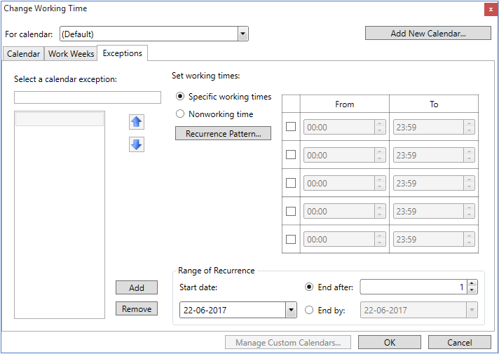 The Exceptions tab provides you the option to add exceptions in the calendar such as marking public holidays or vacation. The following image shows how this tab appears at runtime: