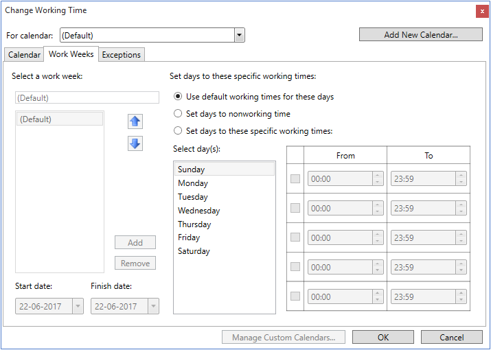 The Work Weeks tab provides option to change the default work week for project calendar, resource calendar, or for any custom calendar that you create. You can also choose or create additional schedule for a range of days that differ from the default work day.