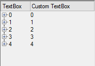 Dim textBox1 As System.Windows.Forms.TextBox = New TextBox() Dim textBox2 As New CustomTextBox() C1TreeView1.AllowEditing = True C1TreeView1.Columns.Clear() Dim column1 As New C1.Win.TreeView.C1TreeColumn() Dim column2 As New C1.Win.TreeView.C1TreeColumn() Dim column3 As New C1.Win.TreeView.C1TreeColumn() Dim column4 As New C1.Win.TreeView.C1TreeColumn() C1TreeView1.Columns.Add(column1) C1TreeView1.Columns.Add(column2) column1.Name = "clnTextBox" column1.HeaderText = "TextBox" column1.Width = 60 column1.DisplayFieldName = "TextBoxValue\TextBoxValue" column1.Editor = textBox1 column1.EditorType = C1.Win.TreeView.C1TreeViewEditorType.Text column2.Name = "cnlCustomTextBox" column2.HeaderText = "Custom TextBox" column2.Width = 90 column2.DisplayFieldName = "TextBoxValue\TextBoxValue" column2.Editor = New CustomTextBox() column2.EditorType = C1.Win.TreeView.C1TreeViewEditorType.Text C1TreeView1.DataMember = "Collection\Collection" C1TreeView1.DataSource = EditorsData.GetData()
