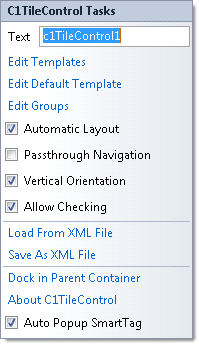In Visual Studio, each component in TileControl for WinForms includes a smart tag. A smart tag represents a short-cut tasks menu that provides the most commonly used properties in each control.