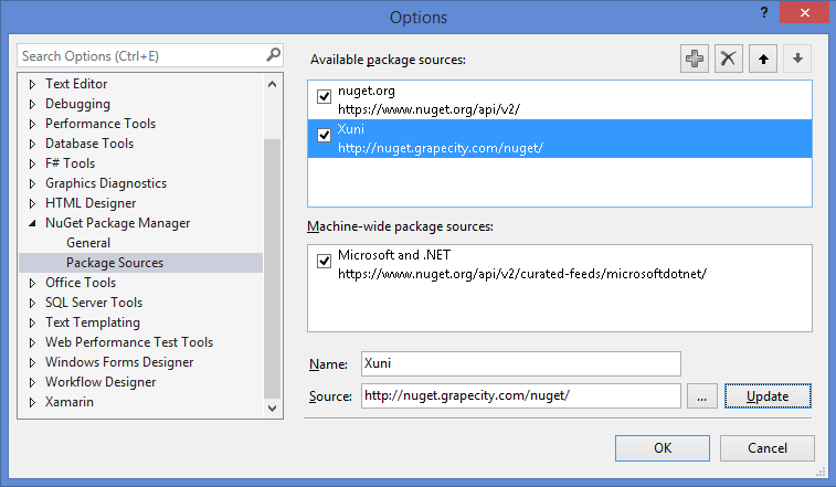 - Click OK. The Xuni feed has now been added as another NuGet feed source.