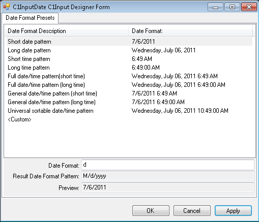 The designer's Date Format Presets tab lists the C1InputDate control's date format options. The DateFormat box shows the date format pattern composed of placeholders (dddd) and literals (for example, the divider). The Preview box shows you how the mask will appear in the Web browser.