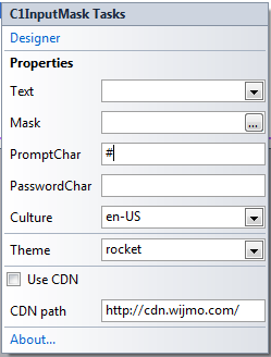 To change the phone number PromptChar property, open the C1InputMask Tasks menu and enter the number sign (#) in the PromptChar text box.