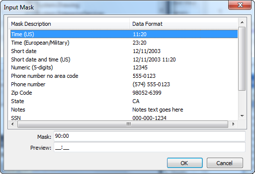 The C1InputMask control uses a mask to distinguish between proper and improper user input. You can define the mask through the visual designers, for example, the C1InputMask Smart Tag or the C1InputMask Designer, or programmatically through the C1InputMask object.