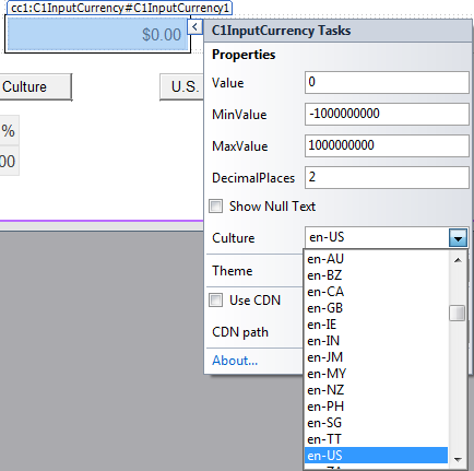 Note that the following topic shows how to use the Culture property for the C1InputCurrency control; however, the Culture property is available for all Input for ASP.NET Web Forms controls.