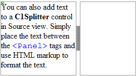 <ContentTemplate> You can also add text to a C1Splitter control in Source view. Simply place the text between the <span style="color: #0000ff; font-family: Courier New"> <Panel></span> tags and use HTML markup to format the text. </ContentTemplate>