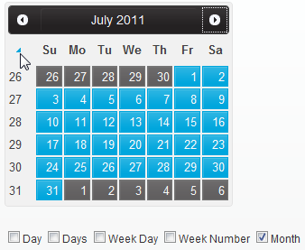 Calendar supports single and multiple date selection. Through the week day and week number selectors you can select groups of days, such as all of the days that fall in Tuesday or all of the days in a specific week. Using the month selector, you can select the days of the entire month.