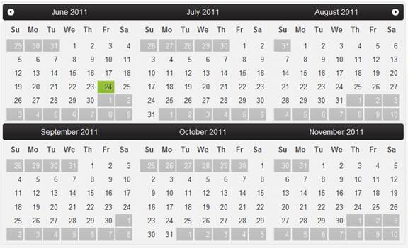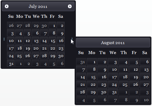 Calendar includes three methods for navigating through the calendar months. Previous and Next navigation buttons allow you to go to the previous or next month. Quick Previous and Quick Next allow you to jump several months ahead or several months behind. And the Popup Calendar Month and Year Selector enable you to select the month and year from the popup calendar.