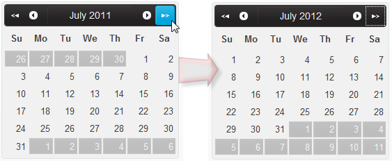 Calendar has optional preview panes, showing the previous and next calendar months. This enables you to view date periods at the beginning or end of a give month without navigating. Just set one property to enable this functionality.