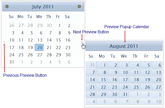 C1Calendar contains preview bars for previewing previous and next calendar months while keeping the current month visible. The preview bars appear at the far left and far right side of the calendar control when the AllowPreview property is set to True. Hovering over the preview bars with your mouse pointer enables the previous or next month.