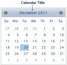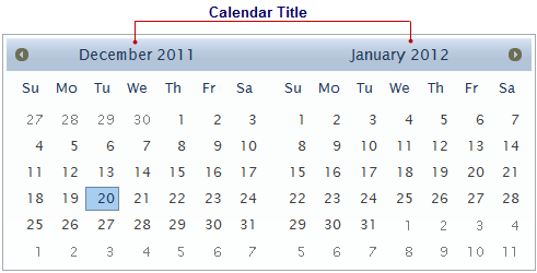 The calendar title is the group title shared by all the month views. It appears at the top of the calendar in a single month or multiple month view. The calendar's title is affected by the type of format strings applied to the TitleFormat property.