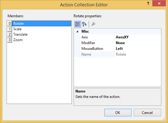 The Action Collection Editor is used for setting up the rotation, scaling, translation, and zooming interactions in the chart at design time. For more information on rotation, scaling, translation, and zooming interactions, see Rotating, Scaling, Translating, and Zooming.