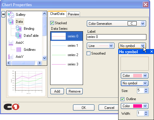 - Select the Data element in the treeview pane of the Chart Properties designer.