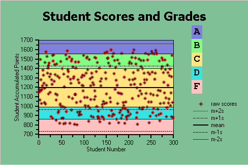 Alarm Zones are a series of bands or shapes that can be placed behind the plotted data, but in front of the chart background. Generally, Alarm Zones are used in much the same manner as grid lines, but the ability to modify the Alarm Zones allows them to be more useful and visually appealing. Also, Alarm Zones can be used to highlight important y-values in charts. For example, the chart below uses five different alarm zones (A, B, C, D, F) that represent the student's grades. Each Alarm Zone is shown in a different color to avoid confusion with the other Alarm Zones. Notice how the Alarm Zones help in showing the important y-values (in this case, the students' accumulated points/grades).