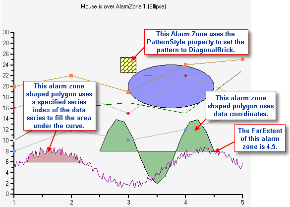 The chart below illustrates several alarm zone properties. Notice how the text below states what alarm zone the cursor is pointing to. This technique can be achieved using the AlarmZoneAtCoord method. The AlarmZoneAtCoord method retrieves a reference to the foremost AlarmZone that lies under the specified coordinates. The array and DataSeries are two different source types used for the polygon data. In the chart below the green polygon uses the array source to get the polygon coordinates filled in by the user. The other polygon uses the DataSeries to get the specified series index from the user.