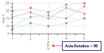 Use the Rotation property to rotate the axis title to 90, 180, or 270 degrees. The 90 and 270-degree rotations are most efficient for vertical axes.