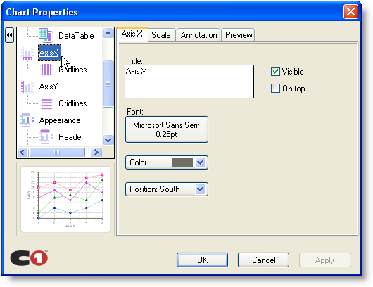 You can select Axis X, Axis Y, or Axis Y2 to modify or create the format style, scale, and annotation of the axes. Each axes element (AxisX, AxisY, and AxisY2) contain the following tabs in the upper right pane of the Chart dialog box: the name of the selected element (AxisX, AxisY, or AxisY2), the Scale, the Annotation, and the Preview tab.