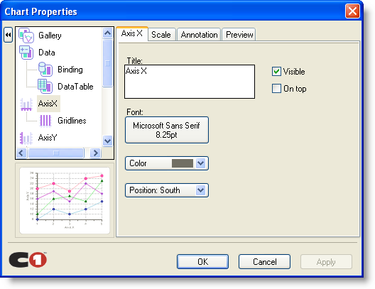 The screen shot below represents the tab name for the selected Axis, in this example it is Axis X. In the Axis tab you can specify the title, font, color, and position of the axis. In addition you have the option to make the title for the axis appear on top by selecting the On top check box.