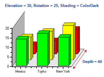When the Depth property is used to modify the depth of the bar chart it does not affect the shape of the columns, however, it affects the shape of the cones, pyramids, and cylinders. The width of the of the cylinders automatically changes with the number of bars on the X axis, but the depth of the bar depends on the Depth property.