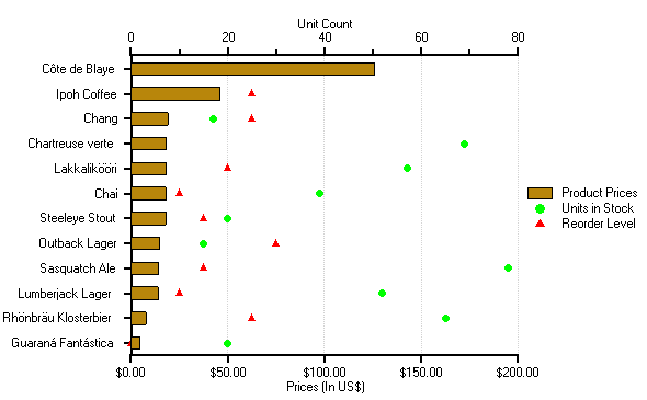 For example, the following chart contains three series. The first shows product unit prices (as bars, plotted against the primary Y-axis), and the others show the number of units in stock and the reorder level (as symbols, plotted against the secondary Y-axis).