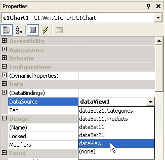 2. Then select a value from the C1Chart.DataSource property drop-down list box.