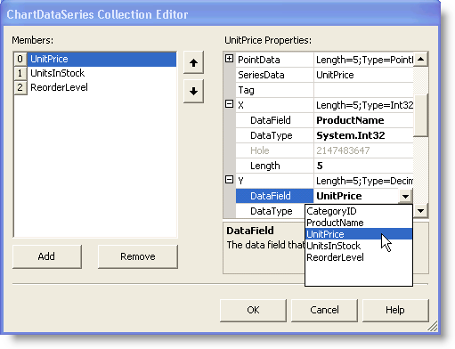 The following image depicts the DataField in the X and Y drop-down list box of the Chart Properties designer: