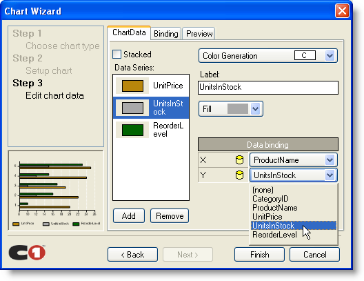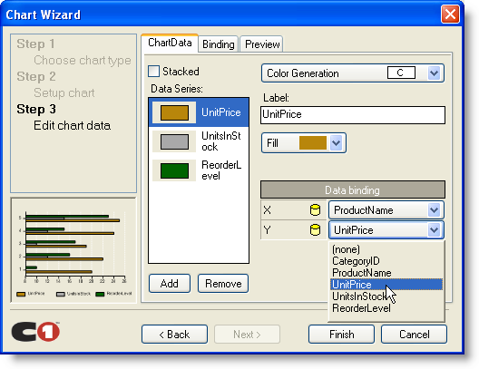 Once the C1Chart DataSource has been set, it is necessary to tell C1Chart which columns in the dataset should be applied to each of the ChartDataSeries. In other words, it is necessary to specify which column of the data source should be used to specify the X values, which column specifies the Y values, and depending upon the ChartType, the columns used for Y1, Y2 and Y3 of each ChartDataSeries.