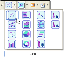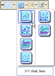 The Chart sub-type command also has a drop-down menu which contains a selection of all the chart sub-types provided by the C1Chart control. Mousing over each chart image exposes a label with the name of the selected chart sub-type. For example, when the Line chart type is selected from the chart-type, the following complex chart sub-types are available: X-Y chart lines, X-Y chart/lines/symbols, X-Y chart/lines/3D, X-Y chart/lines/stacked, X-Y chart/lines/symbols/stacked, X-Y chart/lines/symbols/stacked, and X-Y chart/lines/stacked/3D. There are unique sub-type charts for each chart type.