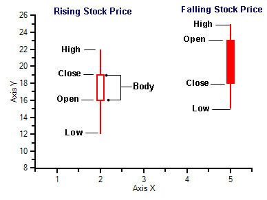 Candle, HiLo, HiLoOpenClose charts are all types of Stock charts used in financial applications to show the opening, closing, high and low prices of a given stock. A Candle chart is a special type of HiLoOpenClose chart that is used to show the relationship between the open and close as well as the high and low. Like, HiLoOpenClose charts, Candle charts use the same price data (high, low, open, and close values) except they include a thick candle-like body that uses the color and size of the body to reveal additional information about the relationship between the open and close values. For example, long transparent candles show buying pressure and long filled candles show selling pressure.