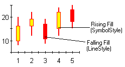 Using the LineStyle and SymbolStyle properties and the HiLoData class, the fill and line properties of each series can be customized. For more information, see Special Candle Chart Properties. To see how to create a candle chart from start to finish using the designer or programmatically, see Candle Chart Tutorial.