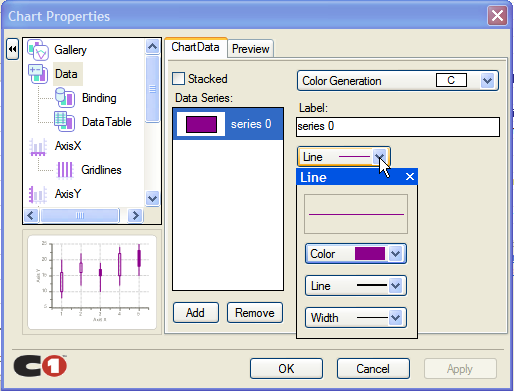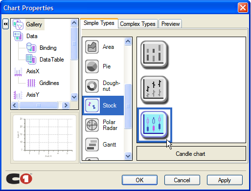 The first step in configuring a chart through the smart tag Chart Properties is to select a gallery type from the wealth of chart types available. From basic chart types like Bar and Lines to more complex charts like Polar and Surface, C1Chart allows you to deal with any data visualization needed.