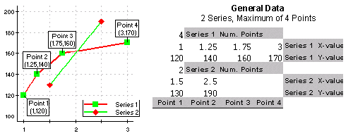 A General layout is used with every chart type. It contains an X and Y array, along with Y1, Y2, Y3, and Y4 arrays. All of these arrays can take data or can be null. For instance, to plot an XY chart with only one series, only the X and Y arrays would contain data. The other Y arrays would remain empty. In addition, unlike an array layout, each series can have a different number of points, and does not have to have matching X values which allows for charting as in the following image: