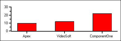 For example, suppose a data source contains 2 columns, one with a company name (string), and one with the number of ComponentOne products purchased by that company. To create a bar chart summarizing this data, one might create a series that uses the number of products on the Y axis, and then create an array with counting numbers and use this array for the X values. Then, create ValueLabels for the X axis, pairing each company name with a count number, thus producing a chart similar to the following: