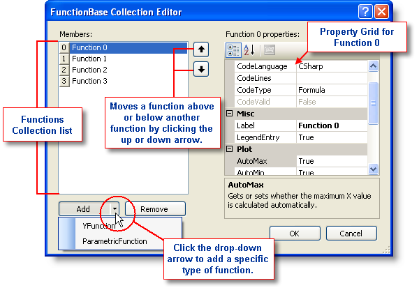 The FunctionBase Collection Editor is used for adding or modifying functions for plotting data at design time. For more information on using the functions for plotting data, see Plotting Functions.